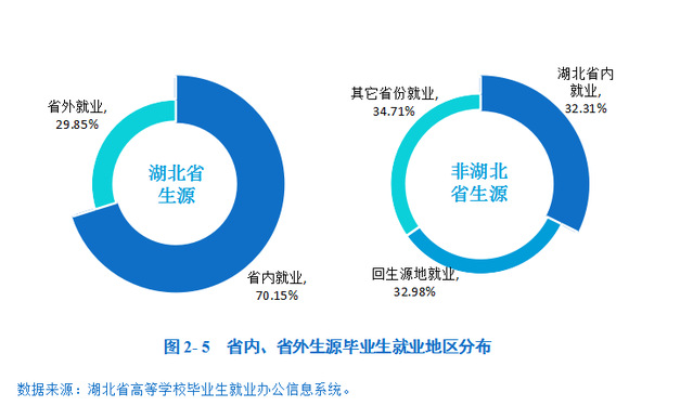 生源地与就业地域交叉分析:70.15%的湖北省生源毕业生选择留在湖北省就业,32.31%的非湖北省生源的毕业生也优先考虑在湖北省就业,32.98%的非湖北省生源毕业生回生源地就业。